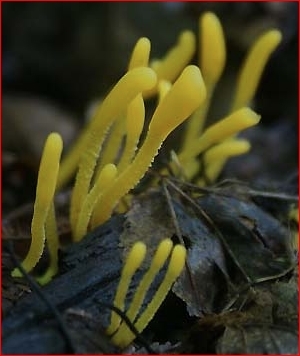 싸리버섯과의 먹는 버섯. 버섯은 가늘고 긴 국수오리모양이며 길이 3~7cm, 직경 1.5~4mm이고 밑부분은 웃부분보다 가늘다. 끝부분은 둥그스름하고 드물게는 끝부분에서 1~2개의 짧은 가지를 치는것도 있다. 겉면은 노란색 또는 감색이다. 버섯살은 흰색 또는 누른색이며 속은 비였다. 포자는 둥그스름하며 색이 없거나 연한 누른색이다.