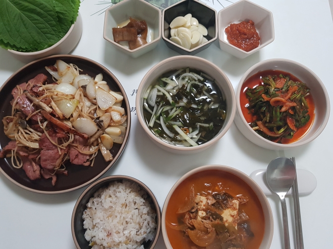 # 저녁_ 잡곡밥, 참치김치찌개, 훈제오리구이, 오이냉국, 부추무침