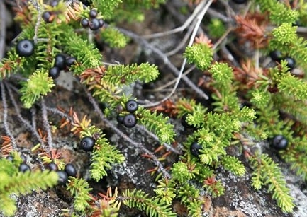 시로미과의 사철 푸른 작은 떨기나무. 줄기는 가지를 많이 치며 높이 10~20cm, 길이 60~90cm이다. 잎은 빽빽이 어긋나게 붙고 진한 풀색이다. 잎몸은 매우 작은 줄모양(길이 5~6mm)인데 변두리는 뒤로 말려서 거의 통모양을 이루고 털이 있다. 5~6월경 짧은 가지에 보라색의 작은 꽃이 피며 암수딴그루이다. 작은 꽃에는 3개의 꽃받침쪽과 3개의 꽃잎이 있다. 수꽃에는 검은보라색을 띤 긴 꽃실을 가진 3개의 수꽃술이 있다. 암꽃에는 6~9칸으로 된 씨앗집과 진한 보라색의 잎모양의 큰 암꽃술대가 있는 1개의 암꽃술이 있다. 열매는 굳은 씨열매이며 직경 1cm인데 검은보라색이고 윤기난다.