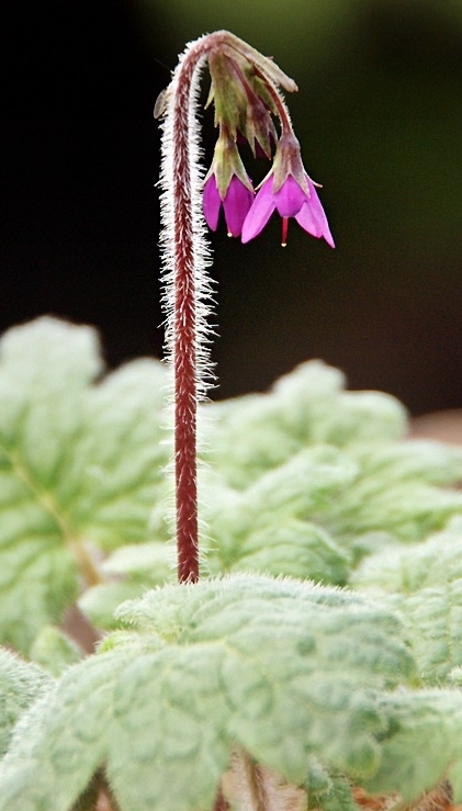 봄맞이과의 여러해살이풀. 식물체에는 짧은 털이 있고 꽃줄기(높이 30cm안팎)는 가늘고 길며 곧추 선다. 뿌리잎은 잎꼭지가 매우 길다. 잎몸은 7~9갈래로 얕게 갈라 지고 변두리에는 둔한 에움이 있다. 7월경 꽃줄기끝에 우산모양꽃차례를 이루고 5~12개의 보라빛붉은색의 꽃이 아름답게 핀다. 꽃받침은 종모양이고 다섯갈래로 갈라 지며 꽃받침쪽은 닭알모양의 타원형이며 끝은 뾰족하다. 꽃싼잎쪼각은 버들잎모양이고 끝은 뾰족하며 변두리에는 톱이가 고르롭지 못하게 있다. 꽃갓은 깔때기모양이며 꽃통부는 짧고 다섯갈래로 갈라 지며 꽃잎은 긴 타원형이고 끝은 둥근모양이다. 수꽃술은 5개이며 꽃통밑부분에 붙어 있다. 암꽃술대는 매우 길며 꽃갓밖으로 나와 있다. 열매는 넓은 타원형의 튀는열매이며 다섯칸으로 되여 있다.