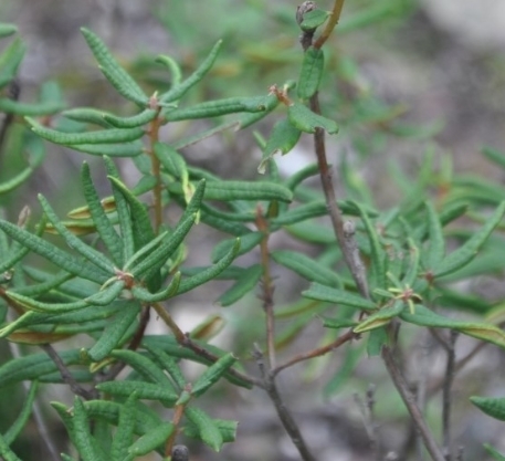 잎몸은 가죽질이고 버들잎모양이며(길이 4cm, 너비 0.7cm정도) 변두리는 밋밋하고 뒤로 약간 말리운다.