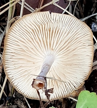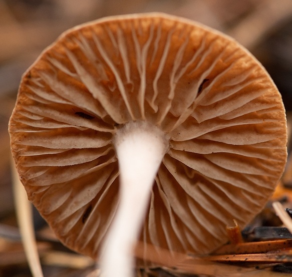 주름살은 완전붙은형~끝붙은형에서 거의 떨어진형으로 되고, 성글며, 담황색~담갈색