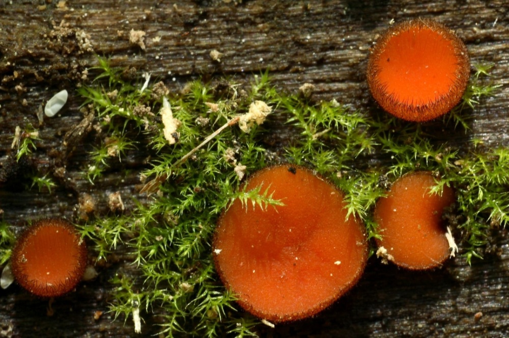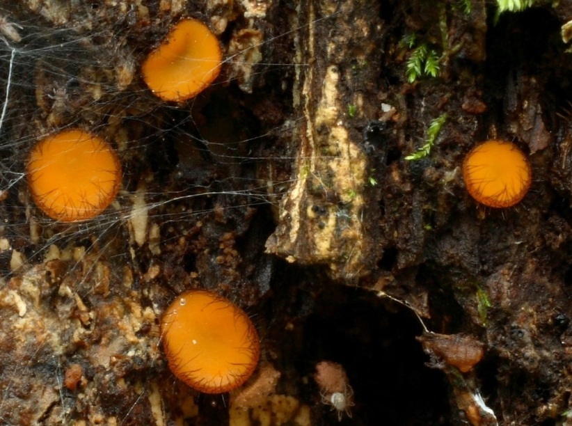 작은 접시모양, 가장자리에는 0.3~1㎜의 암갈색 털이 나 있음, 아랫면에는 암갈색의 가는 털들이 빽빽하게 존재하며 자루 부위까지 이어져 있다 |