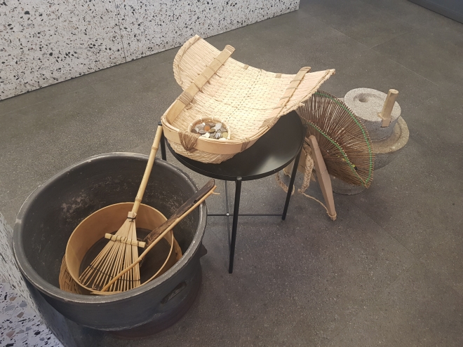 들어가면 보이는 맷돌 및 키 등이 나름 아기자기한 모습으로 놓여 있다.