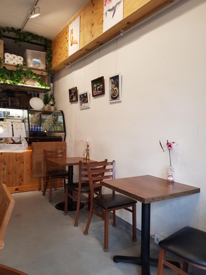 2인 테이블이 3개, 4인 테이블이 2개인 작은 공간의 카페