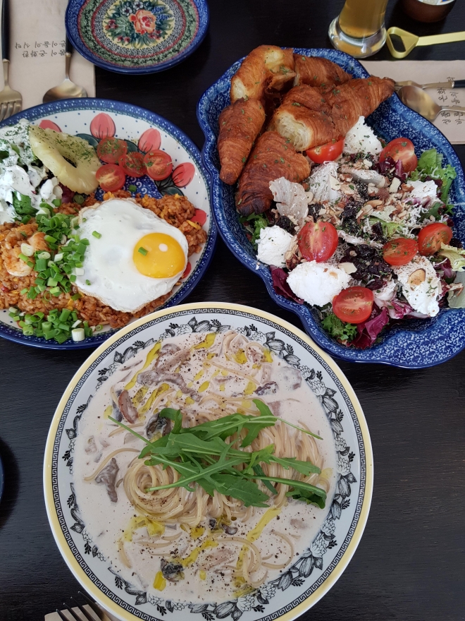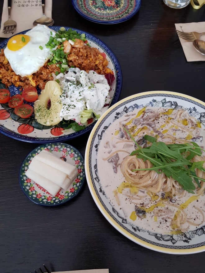 우리가 주문한 나시고랭 쉬림프 필라프와 만조 크림 파스타