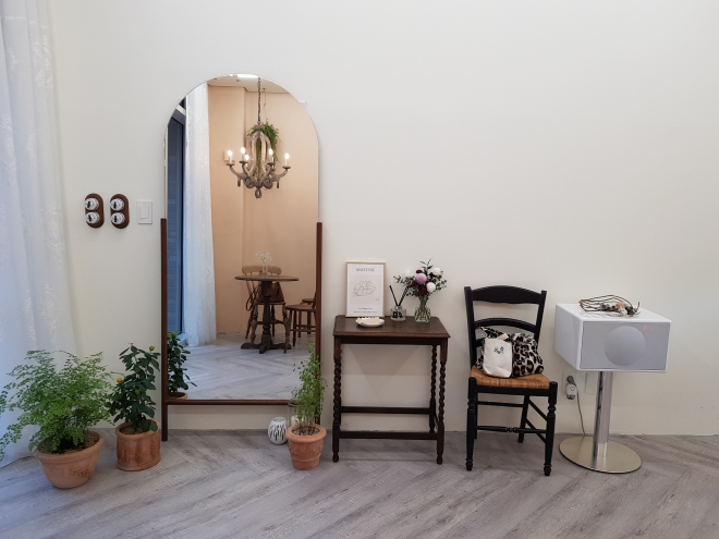 요즘 카페 인테리어로 많이 하는 큰 거울이 있고 스피커, 화분 등 아주 심플하게 꾸며져 있다.