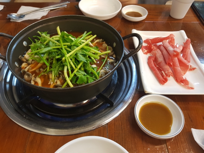 주문하면 금방 나온다. 야채라고는 하지만 느타리버섯과 미나리가 전부, 그리고 소고기 조금