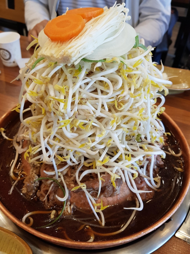 아래 당면과 불고기가 놓여있고 그 위로 숙주가 잔뜩