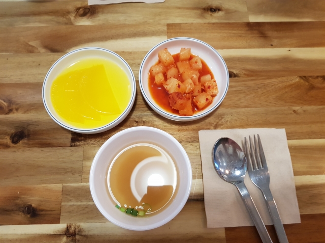 기본으로 제공되는 반찬인 단무지와 깍두기, 그리고 장국