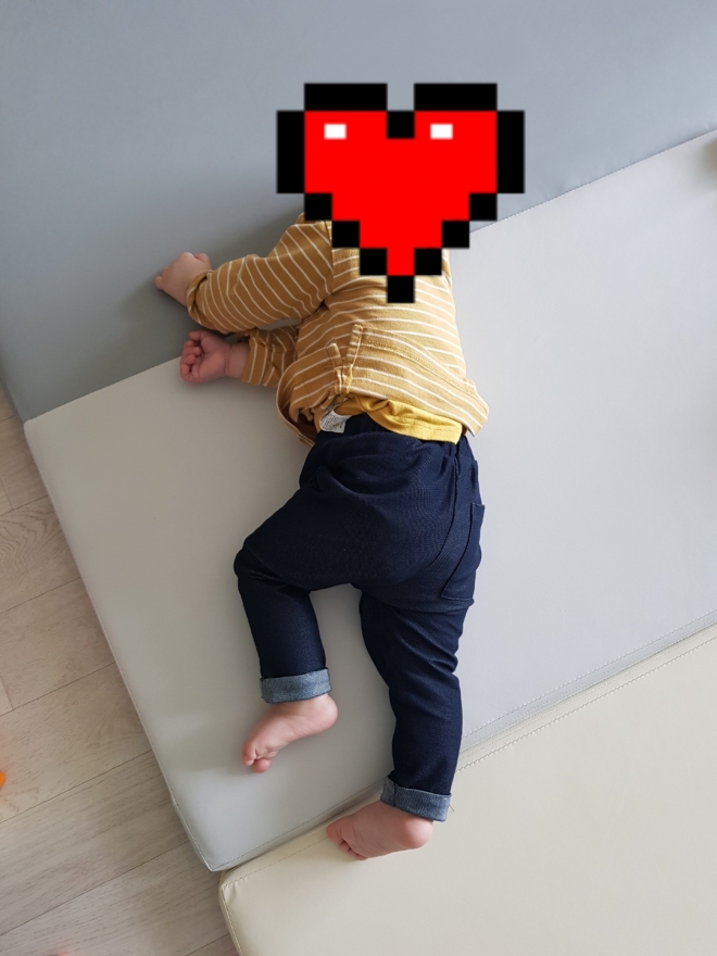 매트 위에서 잔 거라 불편할 만도 한데 잘 자네