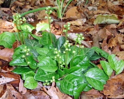 노루발풀과의 사철 푸른 여러해살이풀. 꽃줄기(높이 23cm안팎)는 곧추 서고 가늘고 연약하다.