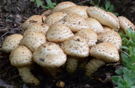 비늘가락지버섯과의 먹는 버섯. 버섯갓은 어릴 때에 반둥근모양이다가 점차 편평하게 펴지며 가운데부분은 낮게 두드러지고 직경 3~10cm이다. 겉면은 연한 누른색 또는 누른밤색이며 거친 밤색비늘이 덮여 있다. 변두리에는 솜털모양으로 된 갓막의 잔여물이 붙어 있다. 버섯살은 노란색이다. 버섯주름은 버섯대에 바른주름으로 붙고 빽빽하며 처음에는 노란풀색을 띠다가 점차 녹쓴밤색으로 된다. 버섯대는 원기둥모양이고 길이 6~12cm, 직경 0.7~1.5cm이며 속은 차 있다. 버섯가락지로부터 웃부분은 매끈하고 노란색이며 아래부분은 버섯갓의 색과 같고 밤색비늘로 덮여 있다. 버섯가락지는 버섯대의 웃부분에 있는데 작고 2중성이며 컴컴한 밤색의 섬유질이다. 포자는 길둥근모양이고 포자무늬는 녹쓴색이다.