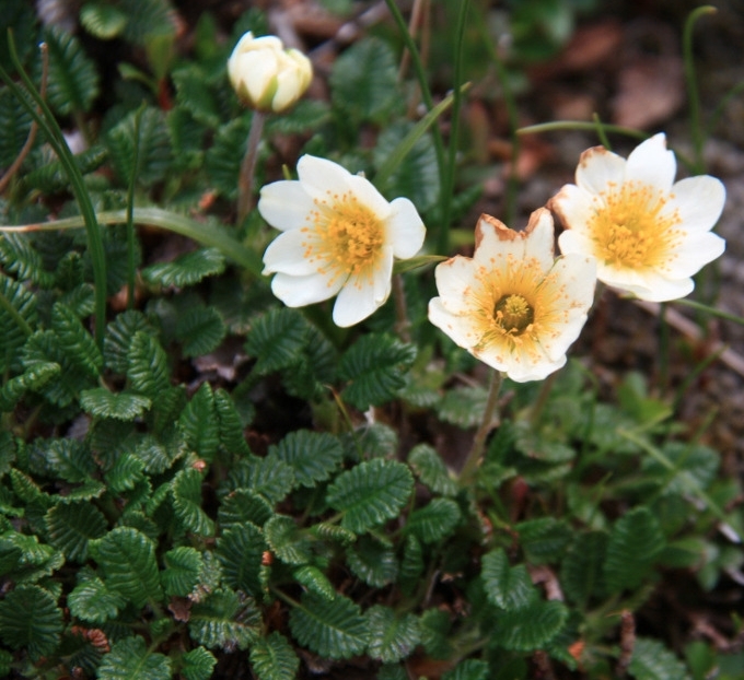 장미과의 사철 푸른 떨기나무. 우리 나라 북부 높은 산(백두산, 관모봉, 차일봉, 와갈봉, 묘향산 등)마루에서 자란다. 줄기는 높이 10cm정도로 자라고 땅겉면으로 퍼지면서 가지를 많이 친다. 잎은 어기여 나고 잎몸은 넓은 길둥근모양이며 긴 잎꼭지가 있다. 잎변두리에는 무딘 톱이가 있으며 잎줄이 오목하게 들어 갔는데 그 사이에는 흰 잔 털이 있다. 잎뒤면에는 흰 솜털이 배게 난다. 6~7월경 줄기끝에 연한 노란색꽃이 한개씩 핀다. 꽃잎은 8개이며 거꿀닭알모양이고 꽃받침보다 길다. 수꽃술과 암꽃술은 많으며 꽃이 진 다음 길게 자란다. 열매는 여윈열매이며 겉면에 흰 털이 빽빽이 덮여 있으며 8~9월에 여문다. 번식은 씨로 하며 포기가르기로도 한다.