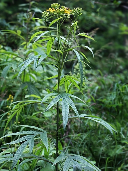 국화과의 여러해살이 큰 풀. 줄기는 곧추 서고 우에서 가지를 치며 높이 1.5m이고 흔히 보라색을 띤다. 잎은 어긋나게 붙고 잎꼭지가 있으며 아래잎은 길이 10~20cm, 너비 10~15cm이고 깃모양으로 깊이 3~7개로 갈라 지며 그 갈래쪽은 버들잎모양이다. 줄기웃잎은 갈라 지지 않고 버들잎모양이다. 모든 잎은 끝이 뾰족하고 변두리에 뾰족한 톱이가 있으며 앞뒤면에 털이 있다. 8~9월경 줄기웃부분 가지끝에 노란 꽃이 머리모양꽃차례를 이루며 많이 핀다. 꽃싼잎쪼각은 긴 타원형인데 끝이 둔하며 풀색이고 바깥꽃싼잎쪼각은 줄모양이다. 머리모양꽃차례주변의 혀모양꽃은 4~5개이며 노란색이고 가운데는 관모양꽃이 있다. 열매는 여윈열매(길이 3mm안팎)이며 털이 없고 우산털은 밤색이다.