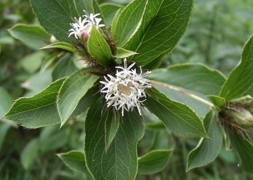 국화과의 여러해살이풀. 뿌리줄기는 고르롭지 못한 덩어리모양이다. 뿌리줄기에서 나온 어린 싹은 흰색의 연한 털에 덮여 있다. 줄기는 곧추 서고 높이 30~60cm이며 굳다. 잎은 어긋나게 붙고 잎꼭지가 있으며 홑잎 또는 3~5갈래로 갈라 지고 갈래쪽잎은 긴 둥근모양 또는 거꿀닭알모양이며 변두리에는 가시모양의 에움이 있고 굳다. 9~10월경 줄기끝에 흰색 또는 연한 붉은색의 꽃들이 반달모양의 머리모양꽃차례를 이루고 핀다. 꽃싼잎은 기와이은모양으로 줄지어 있고 바깥꽃싼잎쪼각은 물고기가시모양이며 안쪽꽃싼잎쪼각은 긴 타원형이고 마른 껍질모양이다. 머리모양꽃차례는 모두 작은 관모양꽃으로 되였는데 그 끝이 다섯갈래로 갈라 지며 그 갈래쪽은 버들잎모양이다. 열매는 여윈열매이며 9월에 여무는데 길이는 5mm이고 은빛흰색의 털이 있으며 우산털은 연한 재빛밤색이다.