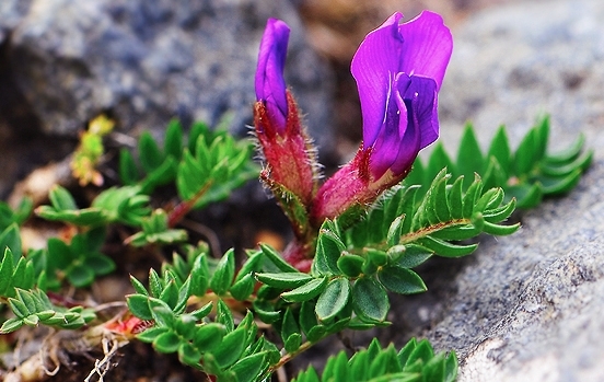 6~7월경 잎사이에서 긴 꽃대(4~8cm)가 나오고 그 끝에 송이모양꽃차례를 이루고 붉은보라색의 나비모양꽃이 핀다.