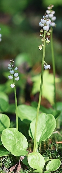 노루발풀과의 사철 푸른 여러해살이풀. 꽃줄기(높이 20cm안팎)는 곧추 서며 모났다. 잎은 뿌리목에서 모여 나고 잎꼭지는 길다. 잎몸은 둥근 닭알모양이며 밑부분은 둥글며 끝은 약간 날카롭고 변두리는 둔한 물결모양의 에움으로 되였고 가죽질이다. 6~8월경 줄기끝에 송이꽃차례를 이루고 몇개의 붉은빛이 도는 흰 꽃이 성기게 피며 꽃꼭지는 짧고 꽃싼잎은 버들잎모양이다. 꽃받침은 다섯갈래로 갈라 졌다. 꽃갓은 다섯갈래로 깊이 갈라 지며 꽃잎은 넓은 타원형이고 끝이 둥글다. 수꽃술은 5개이고 씨앗집은 둥글납작하며 암꽃술대는 1개이며 곧추 서고 암꽃술머리는 5개로 갈라 진다. 열매는 둥글납작한 튀는열매이며 익으면 다섯쪼각으로 벌어 진다.