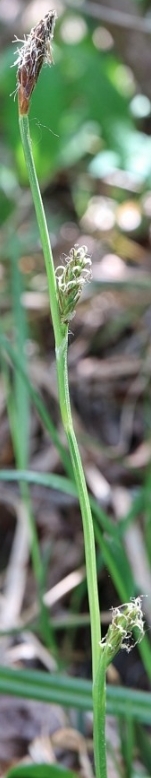 사초과의 여러해살이풀. 뿌리줄기에 뻗는 가지가 달린다. 줄기는 곧추 서며 높이는 20~40cm안팎이며 가늘고 길며 밑부분에 검은보라색의 줄기집이 있다. 잎은 어긋나게 붙고 줄모양이며 꽃대보다 짧고 너비는 2mm안팎이며 끝이 뾰족하다. 털이 없다. 5~6월경 줄기웃부분에 작은 꽃이삭 2~3개가 생긴다. 수꽃이삭은 1개이며 끝에 있고 둥근 기둥모양(길이 12mm안팎)이고 이삭자루는 가늘고 길다. 암꽃이삭은 밑에 붙고 이삭자루는 거의 없으며 아래에 가늘고 작은 꽃싼잎이 있다. 암꽃의 꽃겨는 좁은 닭알모양이며 끝은 가시모양이고 푸른빛이 도는 흰색이며 등면은 풀색이다. 열매는 여윈열매이며 열매주머니는 닭알모양이고 긴 부리가 있고 부리끝이 갈라 졌으며 꽃겨보다 길며 연한 풀색이고 털이 있다.