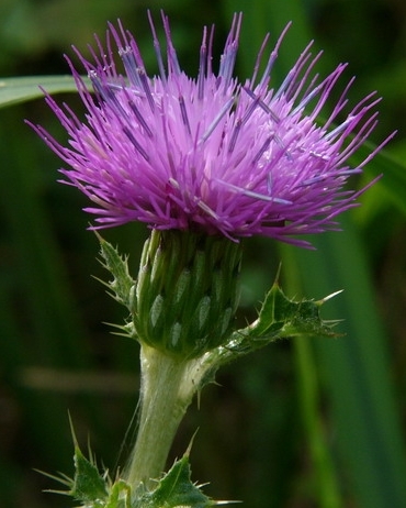 국화과의 여러해살이풀. 소젖모양의 뿌리덩이가 있다. 줄기는 곧추 서며 가지를 많이 치고 높이 1m이다. 잎은 어긋나게 붙고 잎꼭지는 없다. 잎몸은 긴 타원형 또는 닭알모양의 타원형이고 끝이 뾰족하며 변두리에 톱이는 없고 가시모양의 변두리털이 고르롭지 않게 있다. 잎웃면에는 짧은 가시털이 있고 잎뒤면에는 흰 솜털이 빽빽이 있다. 8~9월경 줄기와 가지끝에 보라색의 꽃이 머리모양꽃차례를 이루고 핀다. 꽃싼잎쪼각은 버들잎모양이고 끝이 뾰족하며 기와이은모양으로 줄 지어 있다. 꽃차례는 모두 관모양꽃으로 되여 있다. 열매는 여윈열매이며 재빛밤색의 우산털이 있다.