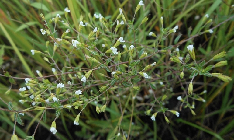 현삼과의 한해살이풀. 줄기(높이 30cm안팎)는 가늘고 곧추 서며 가지를 친다. 잎은 마주 붙고 잎꼭지는 없다. 잎몸은 버들잎모양(길이 6mm안팎)이고 끝은 둔하고 변두리에 둔한 톱이가 있다. 8~9월경 잎아귀에서 1개의 가는 꽃줄기가 나와 그 끝에 연붉은흰색의 입술모양꽃이 핀다. 꽃줄기는 잎보다 길며 길이 1cm안팎이다. 꽃받침은 종모양이고 다섯갈래로 갈라 진다. 꽃갓은 입술모양이며 웃꽃입술은 아래꽃입술보다 길다. 열매는 튀는열매이며 익으면 3개로 벌어 진다.