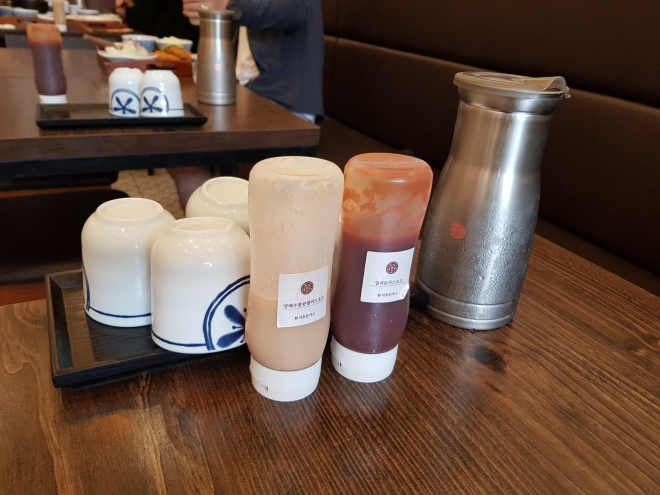 테이블 위에는 돈가스 소스와 샐러드 소스가 함께 준비되어 있다.