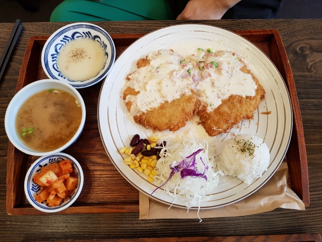 돈가스에 크림 소스는 맛을 한층 더 느끼하게 만들었다.