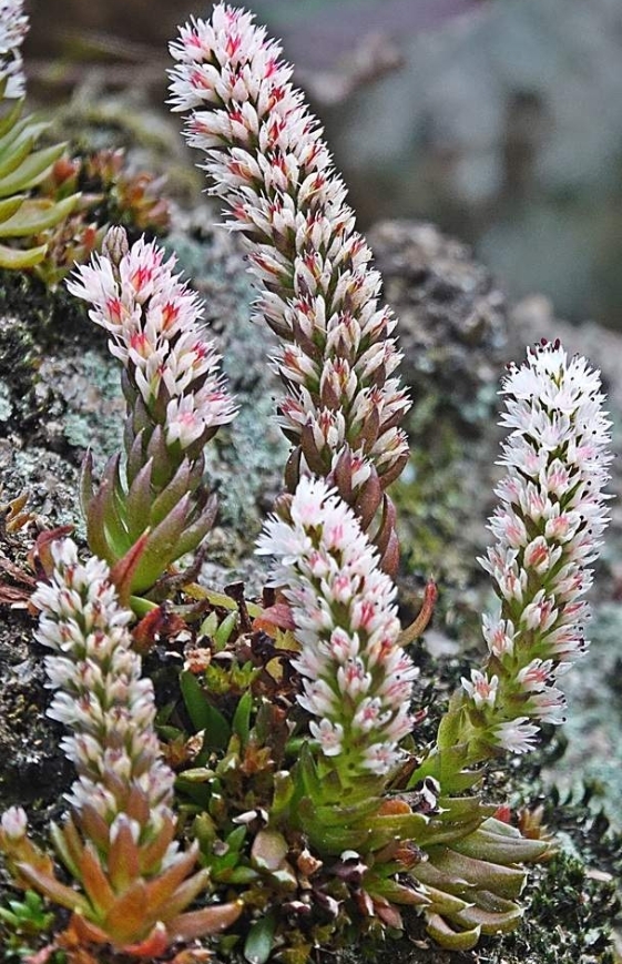 돌나물과의 여러해살이풀. 뿌리줄기는 짧고 굵다. 줄기는 곧추 서고 높이 7~15cm이다. 뿌리목에서 나온 잎은 점차 모여 난다. 줄기잎은 어긋나게 붙으며 긴 타원형 또는 긴 타원형의 주걱모양이고 끝은 뾰족하다. 뿌리잎과 줄기밑잎의 끝에는 손톱모양의 곁달림이 있고 살쪘으며 풀색이다. 8~9월경 긴 꽃꼭지가 곧게 나와 밑에는 잎이 빽빽이 붙으며 그 끝에는 가늘고 긴 둥근 기둥모양의 송이꽃차례를 이루고 붉은보라색꽃이 많이 모여 핀다. 꽃꼭지는 짧고 꽃싼잎은 버들잎모양이며 끝이 뾰족하다. 꽃받침쪽은 5개인데 버들잎모양이며 꽃잎도 5개이며 거꿀버들잎모양이고 밑부분은 서로 붙어 있다. 수꽃술은 10개이고 꽃잎보다 좀 길다. 씨앗집은 5개이고 암꽃술대는 짧고 작은 비늘쪽이 있다. 열매는 긴 타원형의 쪽꼬투리열매이며 량끝이 뾰족하다. 바위솔보다 식물체는 작으며 꽃은 붉은보라색이고 잎끝에 손톱모양의 곁달림이 있다.