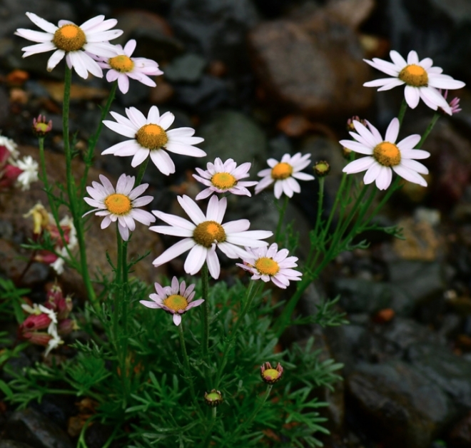 꽃차례주변의 혀모양꽃은 연한 붉은색이고 가운데 관모양쪽은 노란색이다. 열매는 여윈열매이다.