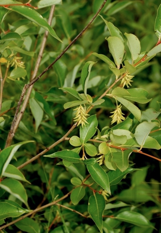 버드나무과의 잎이 지는 떨기나무이며 높이는 1~3m이다. 햇가지는 벽돌색이고 윤기가 있다.
