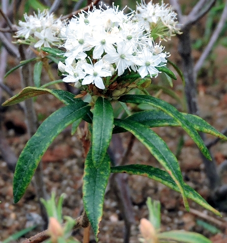잎몸은 가죽질이고 버들잎모양이며(길이 4cm, 너비 0.7cm정도) 변두리는 밋밋하고 뒤로 약간 말리운다.