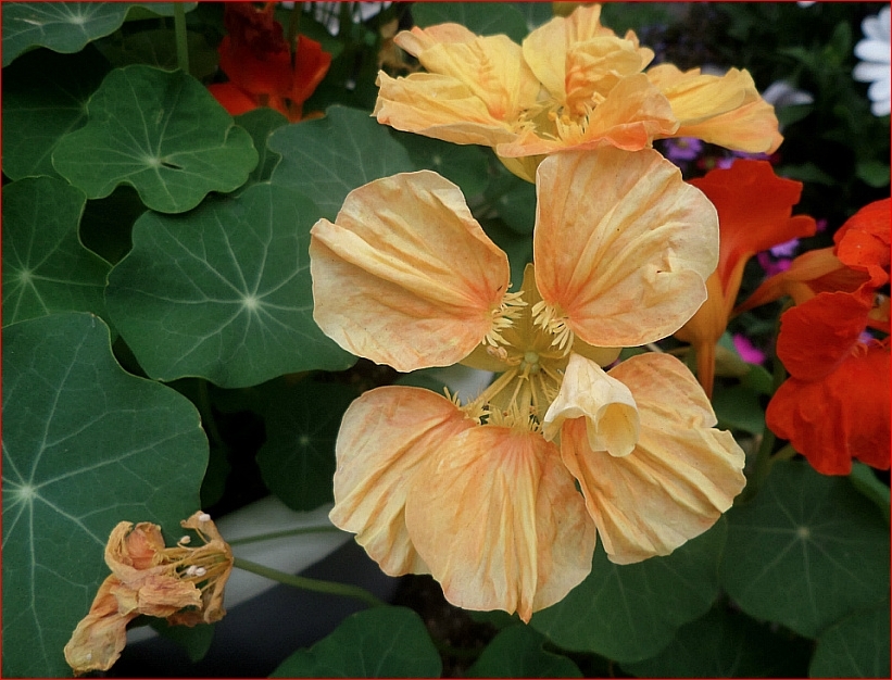 많은 원예품종이 있다. 줄기는 덩굴지며 1~3m까지 자란다. 높이 30cm정도의 포기를 형성하는 품종도 있다. 잎은 직경 5~15cm이고 련꽃잎모양이며 긴 잎꼭지가 있다. 여름부터 가을기간 잎아귀에서 긴 꽃대가 나오고 그 끝에 직경 4~7cm의 노란색, 감색, 붉은색꽃이 하나씩 핀다. 꽃은 외첩이며 꽃잎은 5개인데 2개는 작고 아래 3개는 크다. 꽃받침잎도 5개인데 밑부분이 합쳐 져 2~3cm되는 꽃뿔을 이룬다. 수꽃술은 8개인데 그 길이가 서로 다르며 암꽃술머리는 3갈래로 갈라 졌다. 열매는 둥글납작한데 3개의 모가 있고 익어도 버그러지지 않으며 그안에 콩팥모양의 씨앗이 들어 있다. 번식은 씨앗 또는 가지심기로 한다. 씨앗을 심어서 50~60일이면 첫 꽃이 피기 시작하는데 줄기가 자라나면서 계속 핀다. 장마철에는 적게 피다가 가을에 다시 무성해 지면서 서리 내릴 때까지 핀다. 땅이 지나치게 비옥하면 줄기와 잎만 무성하게 자라면서 꽃이 잘 피지 않는다.
