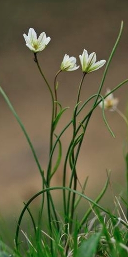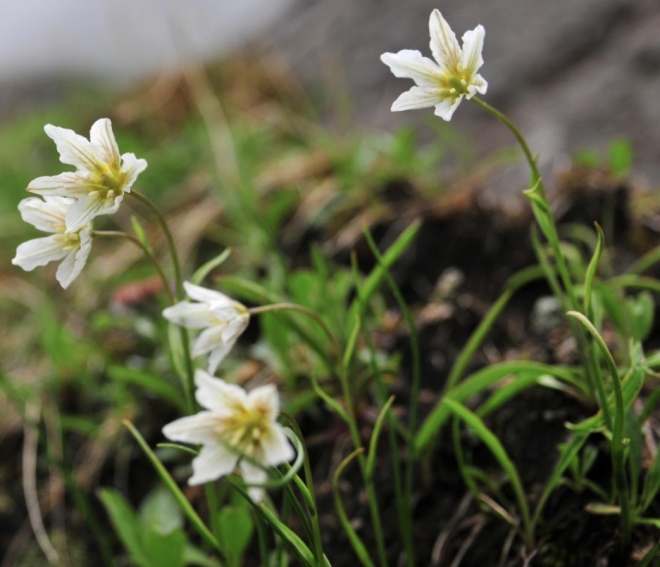 나리과의 여러해살이풀. 뿌리줄기는 실북모양(길이 3cm안팎)인데 검은재색의 묵은 줄기집에 싸여 있다. 줄기(높이 10~15cm)는 가늘고 길며 곧추 선다. 뿌리목에서 나온 잎은 2개인데 잎몸은 줄모양(길이 5~11cm)이며 둔하게 세모졌고 끝은 뾰족하며 솔잎과 비슷하다. 줄기잎은 줄기가운데에 2~3개가 어긋나게 붙고 잎몸은 버들잎모양이며 끝은 뾰족하고 뿌리잎보다 짧고 넓다. 7월경 줄기끝에 1개의 노란붉은빛이 도는 흰 꽃이 핀다. 꽃울은 넓은 종모양(직경 1.5cm안팎)이며 꽃울쪼각은 6개이고 긴 타원형이다. 수꽃술은 6개이며 꽃울쪼각보다 짧다(꽃울쪼각의 1/2). 씨앗집은 타원형이며 암꽃술대는 짧다. 열매는 넓은 타원형의 튀는열매(길이 7mm안팎)이고 세모졌으며 밤색이다.