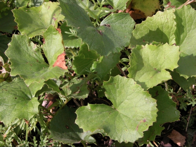 국화과의 여러해살이풀. 줄기는 곧추 서며 높이는 30cm안팎이다. 꽃줄기에 긴 닭알모양 또는 줄모양의 꽃싼잎이 어긋나게 붙어 있다. 뿌리잎은 잎꼭지가 대단히 길고 짧은 털이 있다. 잎몸은 둥근 심장모양이고 변두리에 고르롭지 못한 에움이 있다. 5~7월경 줄기우에서 갈라 진 가지끝에 흰빛이 도는 노란 꽃이 머리모양꽃차례를 이루며 고른꽃차례모양으로 배치된다. 꽃싼잎은 긴 닭알모양이며 꽃싼잎쪼각은 줄모양 또는 버들잎모양이며 끝은 뾰족하다. 머리모양꽃차례는 모두 관모양꽃으로 되여 있다. 열매는 여윈열매이며 흰 우산털이 있다.